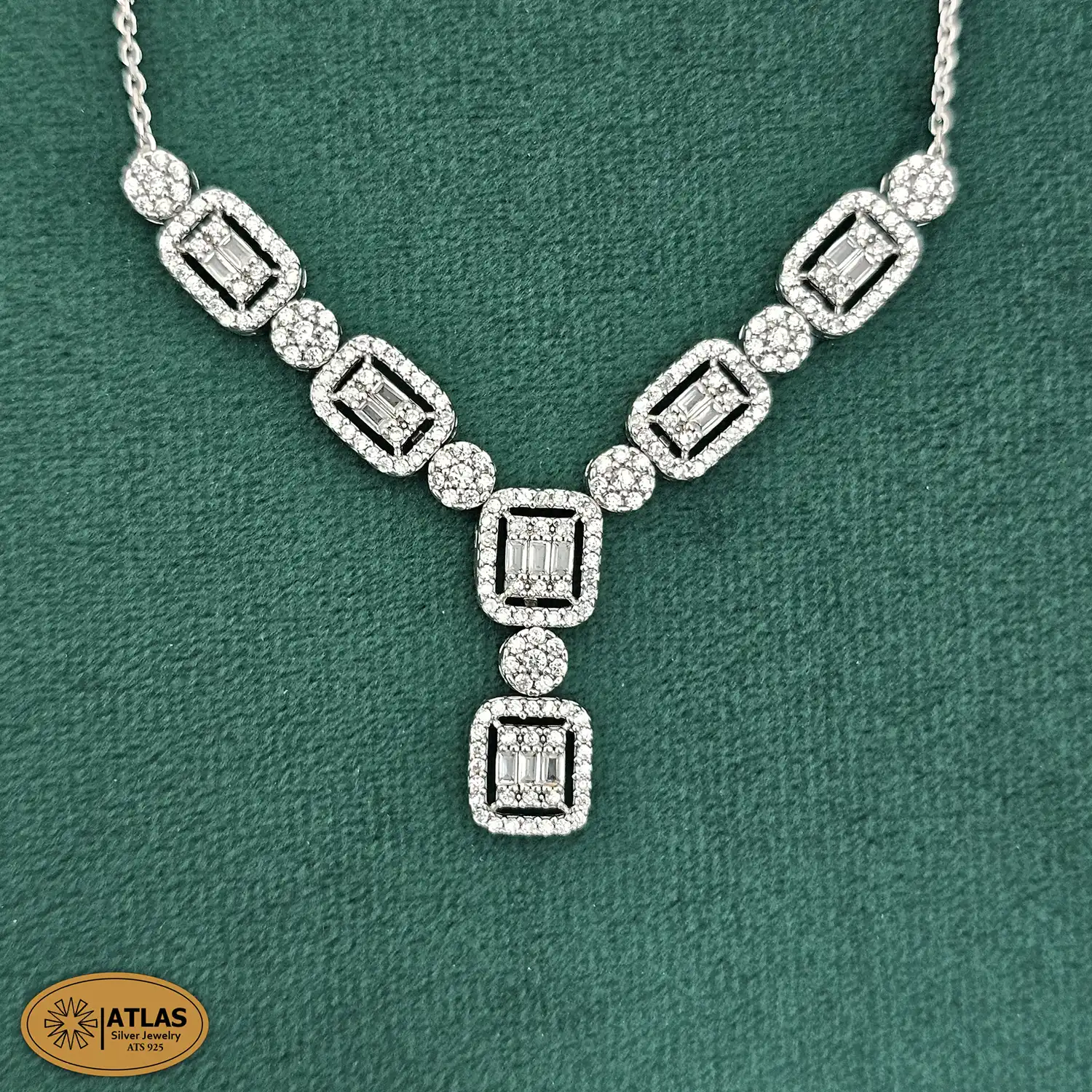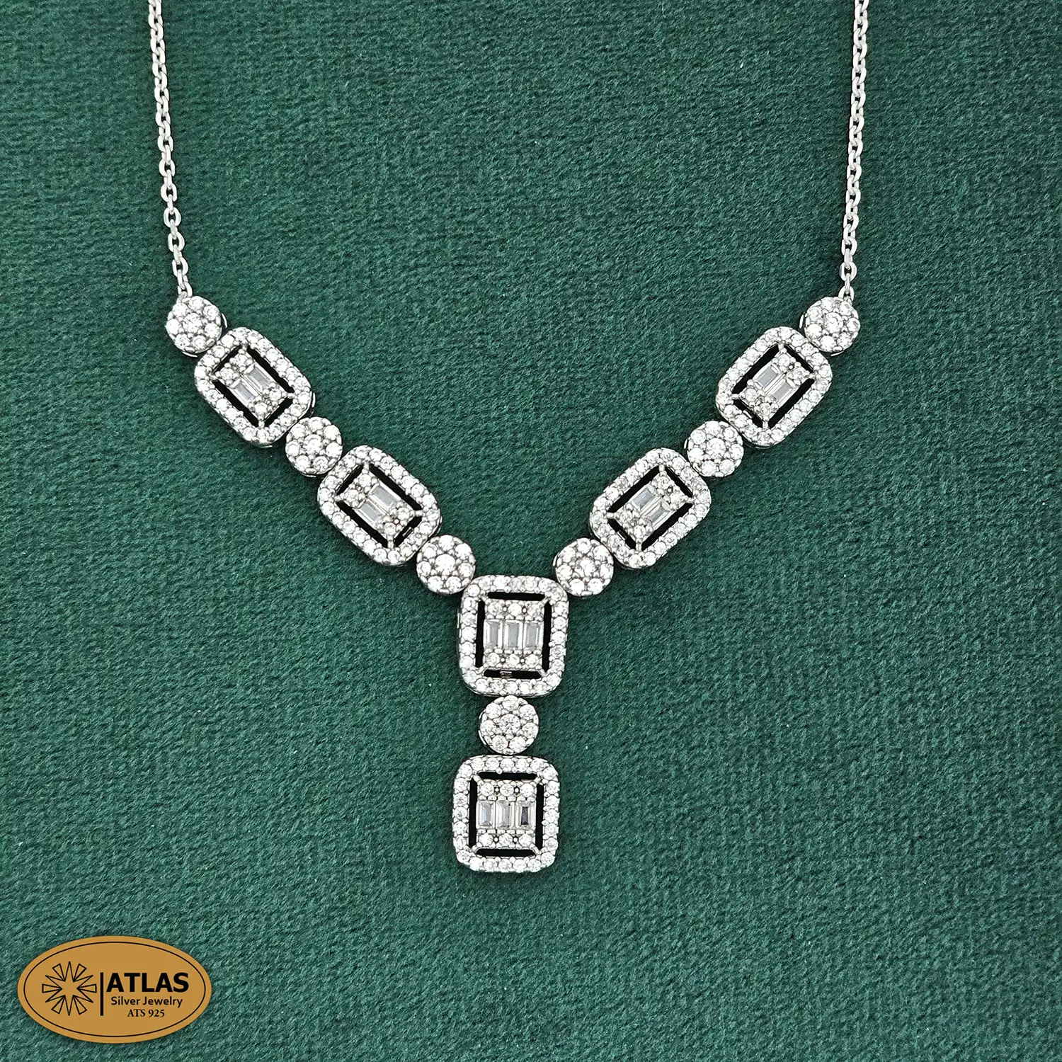 سرویس نقره زنجیری امرالدکات با نگین های برلیان و باگت 17.3 گرمی نقره اصل 925